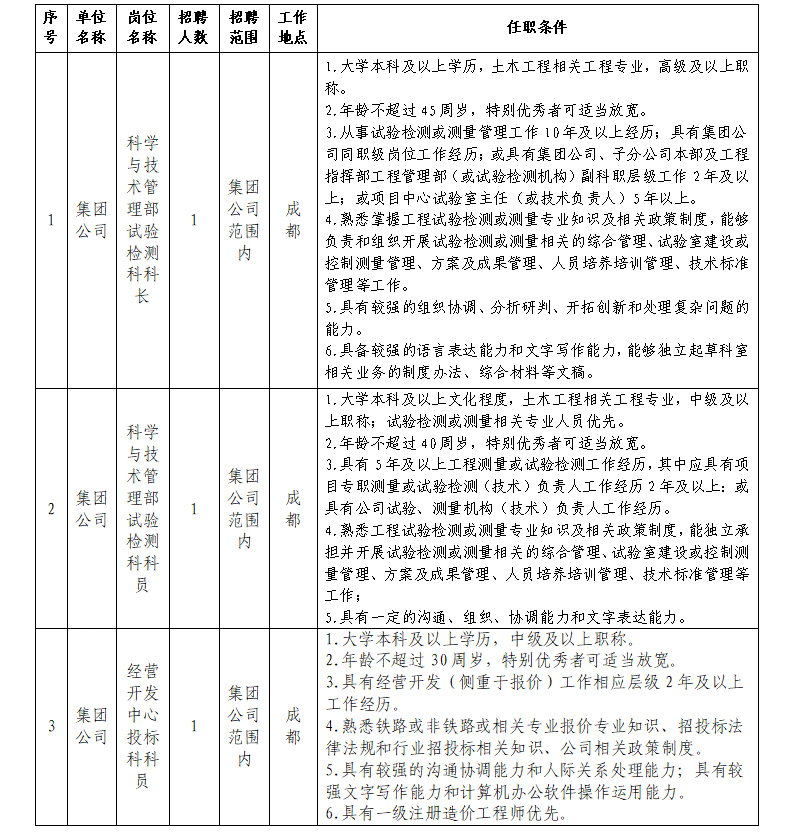 此次公開競聘主要包含2個崗位,主要為集團(tuán)公司科學(xué)與技術(shù)管理部試驗檢測科,經(jīng)營開發(fā)中心投標(biāo)科,競聘情況詳見下表。